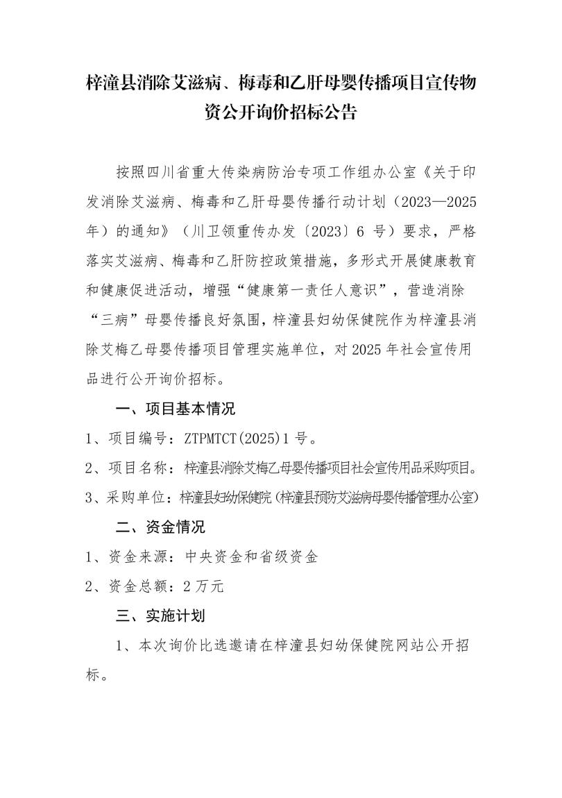 梓潼县消除艾滋病、梅毒和乙肝母婴传播项目宣传物资公开询价招标公告