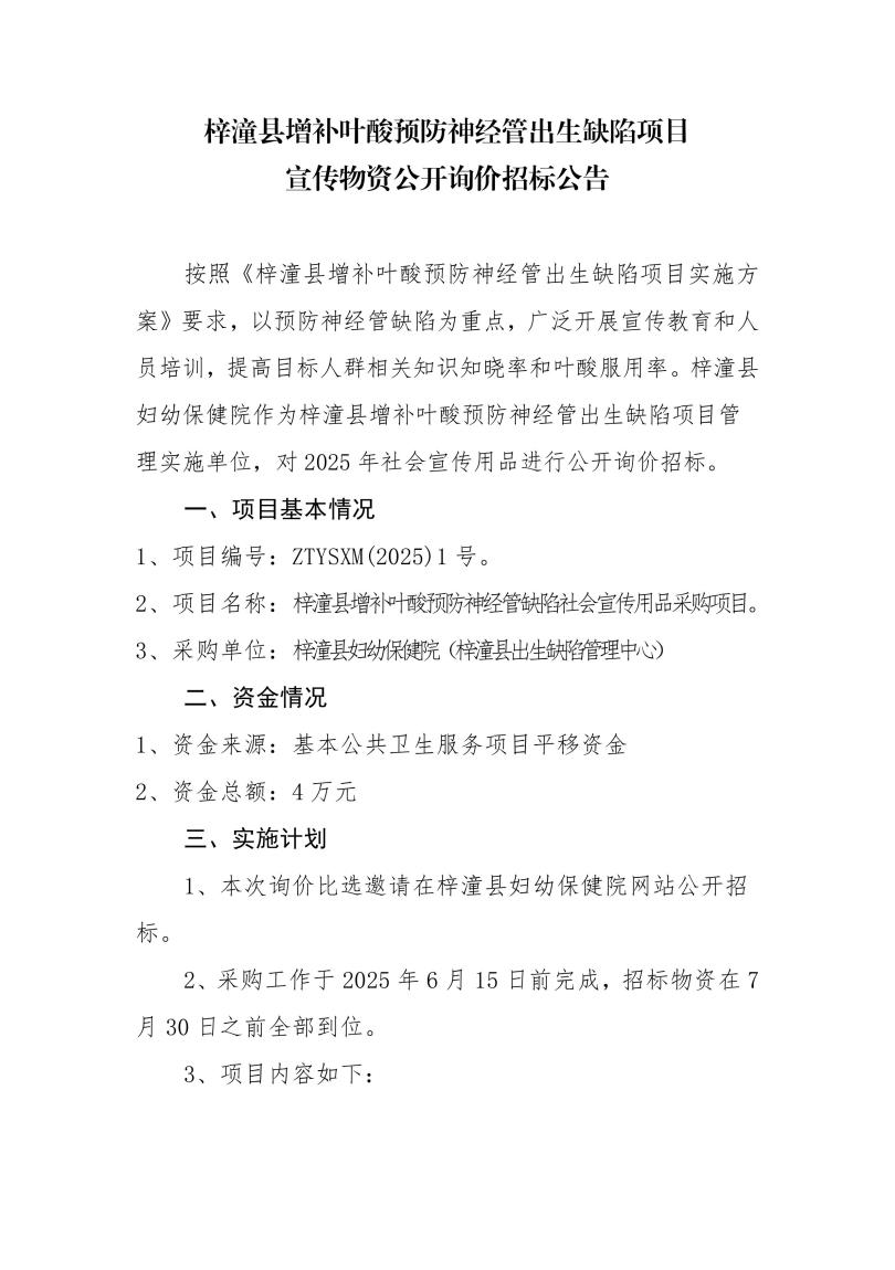 梓潼县增补叶酸预防神经管出生缺陷项目 宣传物资公开询价招标公告